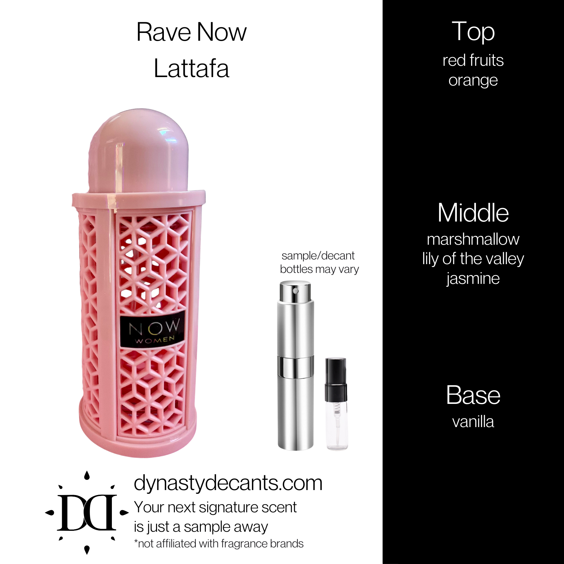 Rave Now Women by Lattafa is a bright, sweet, and plush vanilla-gourmand fragrance perfect for day or evening wear.