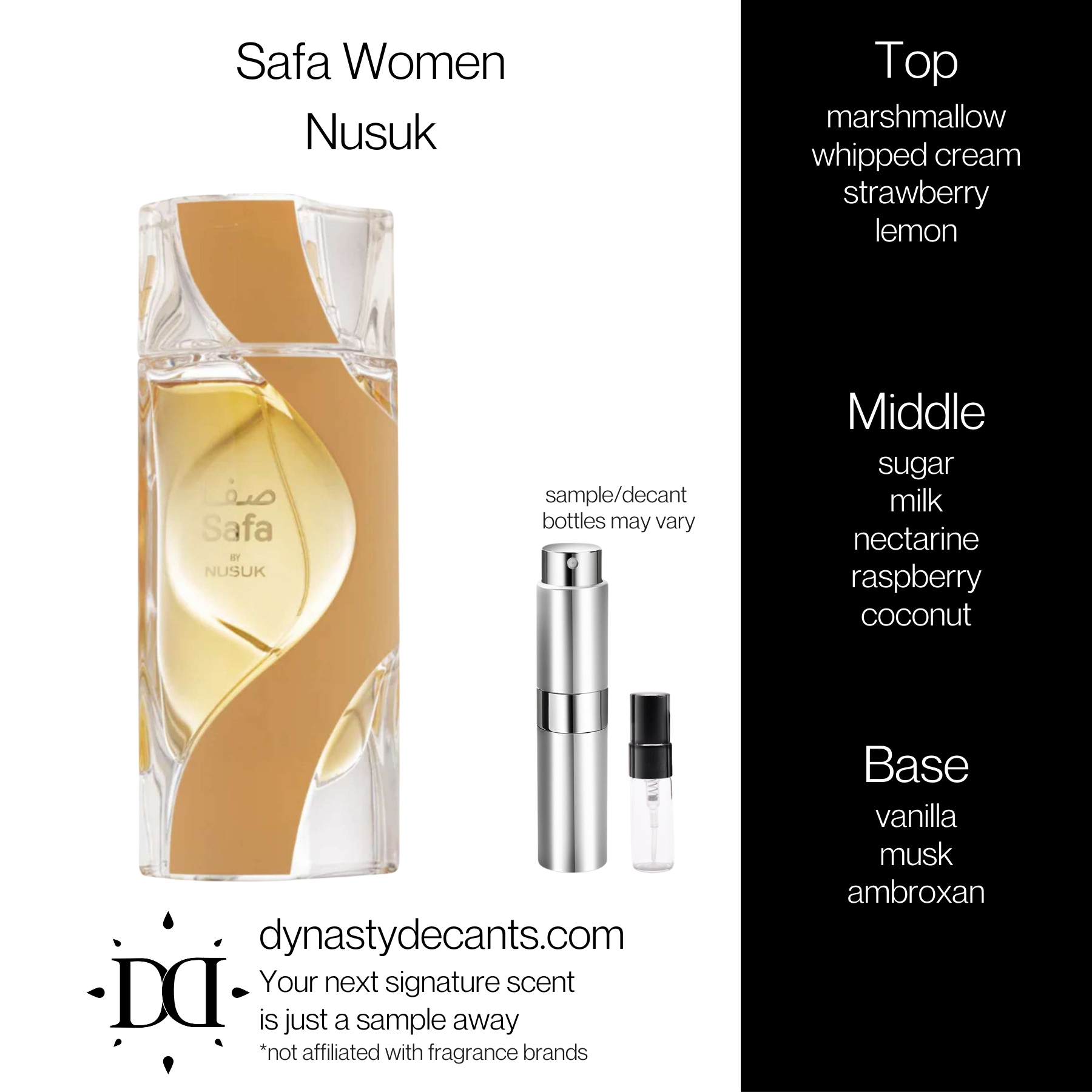 Safa Women by Nusuk is a candied, creamy gourmand scent that wraps you in pure, irresistible sweetness.