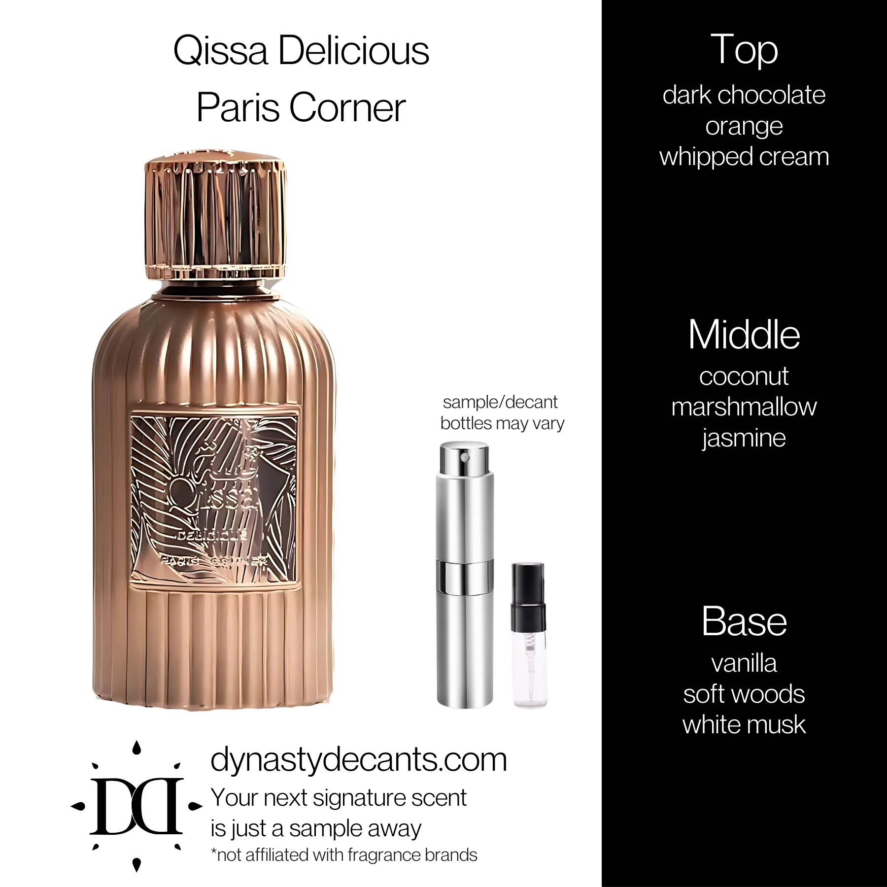 This scent is a decadent journey, opening with a bold embrace of dark chocolate, sharp yet smooth, instantly brightened by a flash of sun ripened orange. A cloud of whipped cream softens the entrance, guiding you into the heart where tropical sweetness blooms. Here, the air is thick with the scent of sun warmed coconut and pillowy marshmallow, given an unexpected floral elegance by a whisper of jasmine. As the fragrance settles, it melts into a comforting foundation of creamy vanilla, grounded by the quiet strength of soft woods, leaving a lasting, tender echo of white musk that feels like a second skin. Wearing this is like draping yourself in a velvet cape of gourmand indulgence, a sweet, rich warmth that is both playful and deeply comforting.